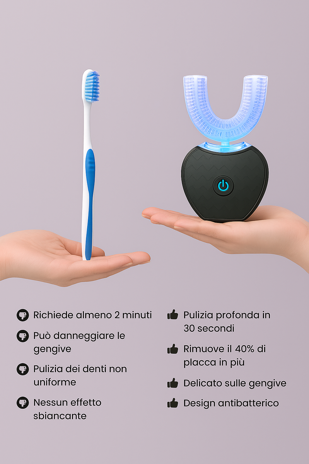 ⭐⭐⭐⭐⭐ Il nostro spazzolino è progettato con una tecnologia brevettata che permette una pulizia simultanea di tutti i denti in soli 30 secondi. La sua forma unica e il movimento automatizzato garantiscono una copertura completa e uniforme, senza la necessità di movimenti manuali.